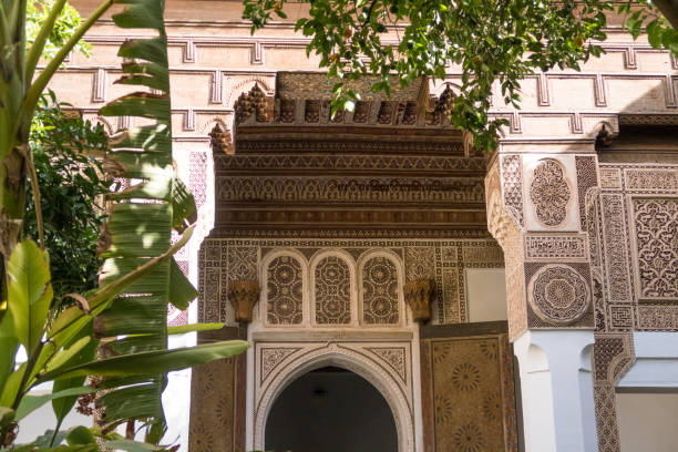 Discover intricately decorated rooms once reserved for the vizier’s wives and concubines, featuring carved stucco, zellij tiles, and painted cedar ceilings.