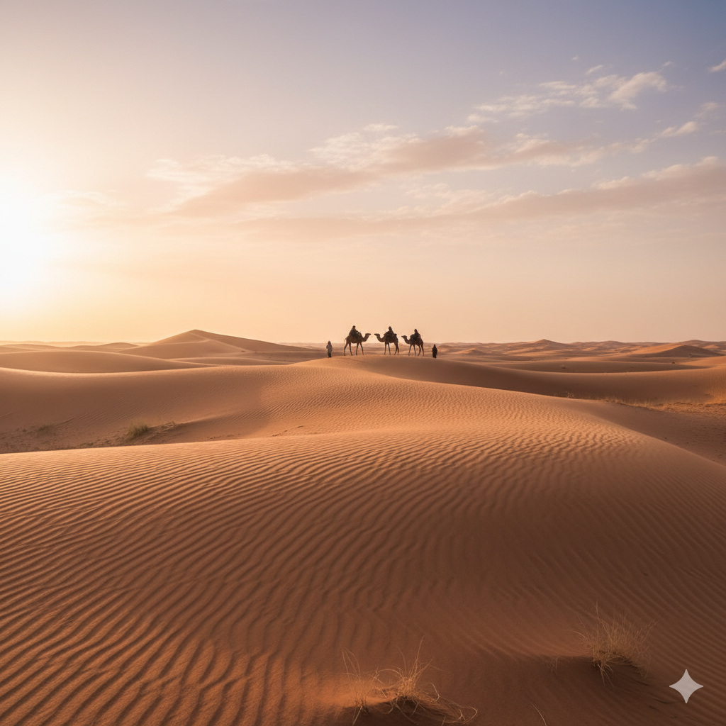 Early morning optional camel ride on dunes at sunrise (or later in day, but sunset is common).
